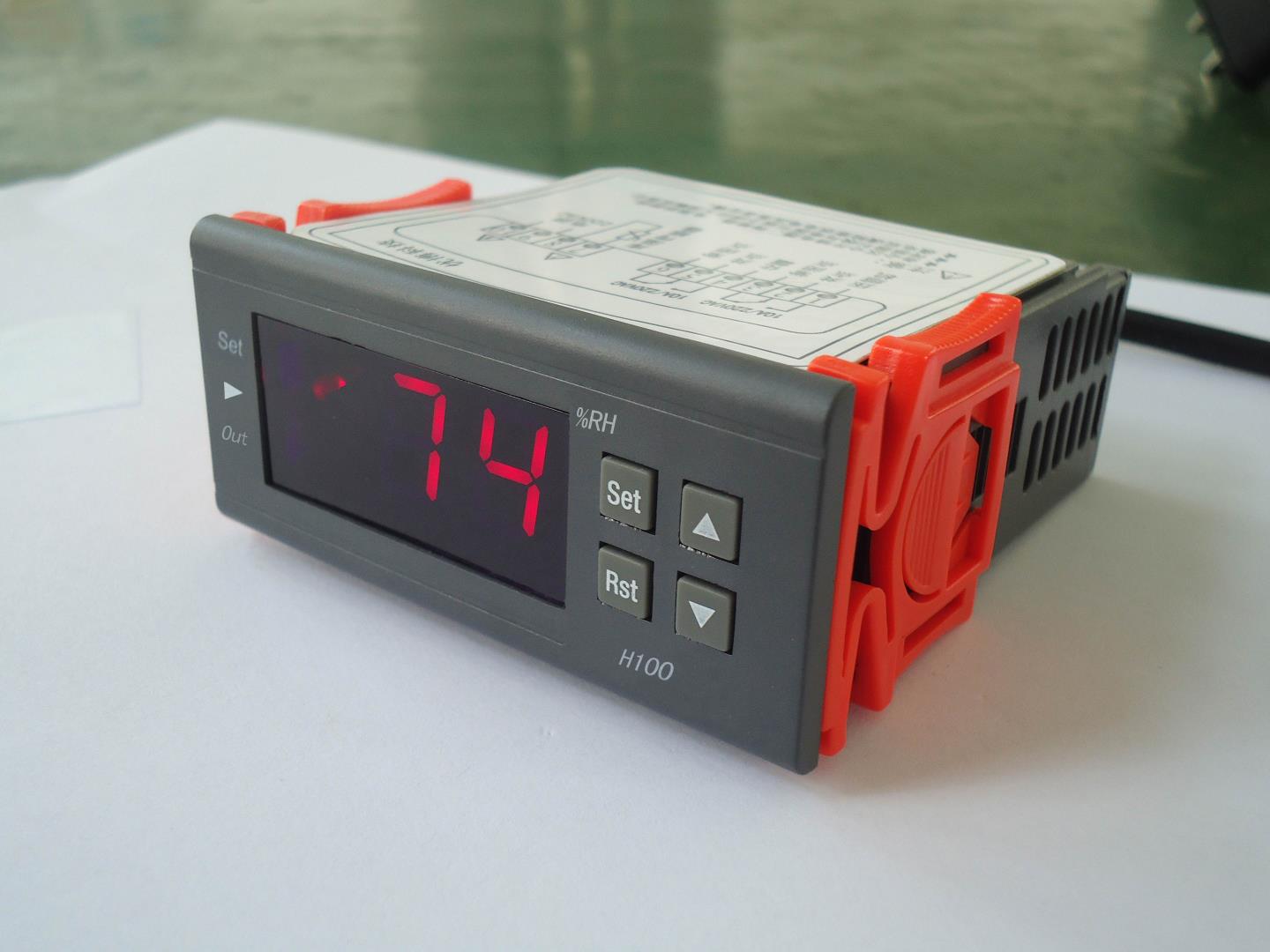 一、产品概述 H100采用集成电路式温度传感器作为感湿原件,具有灵敏度高、相应速度快、一致性好等特点,可用于相对湿度的测量、显示与控制。主要功能包括:加湿、除湿模式可转换,按照湿度设定值和回差进行湿度控制;控制输出保护延时;温度校正功能;湿度超限报警和传感器故障报警功能;传感器故障后比例开停机时间可调;键盘锁功能。 二、规格尺寸 ☆ 面板尺寸:长75×宽34.5(毫米); ☆ 安装开孔尺寸:长71×宽29(毫米); ☆ 整机尺寸:长75×宽34.5×深85(毫米) 三、技术参数 ☆ 电源:220VAC(1+10%-15%),50/60HZ ☆ 整机功耗:小于3W; ☆ 测量范围:0%RH~99%RH; ☆ 控制范围:10%RH~99%RH; ☆ 温度分辨率:1%RH; ☆ 测温精度:2.5℃时,±(5%RH+0.5字)10~40℃时,0%RH~59%RH时±(6%RH+0.5字),其 余±(8%RH+0.5字), ☆ 传感器年漂移:±0.5%RH ☆ 工作输出:接点容量220VAC,可直接驱动单相0.5HP/220VAC及以下的负载; ☆ 前面板防护等级:IP54; ☆ 运行环境温度:0℃~60℃; ☆ 存储温度:-30℃~75℃; ☆ 相对湿度:20~85%RH(无结露)。 指示灯状态说明: